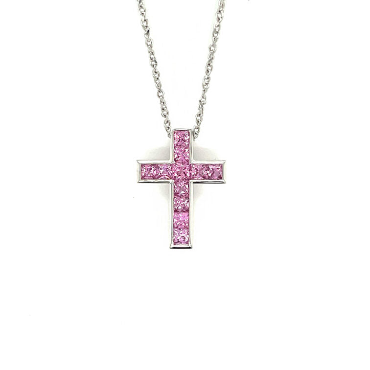 18K White Gold Cross Design Pendant Set with Pink Sapphire