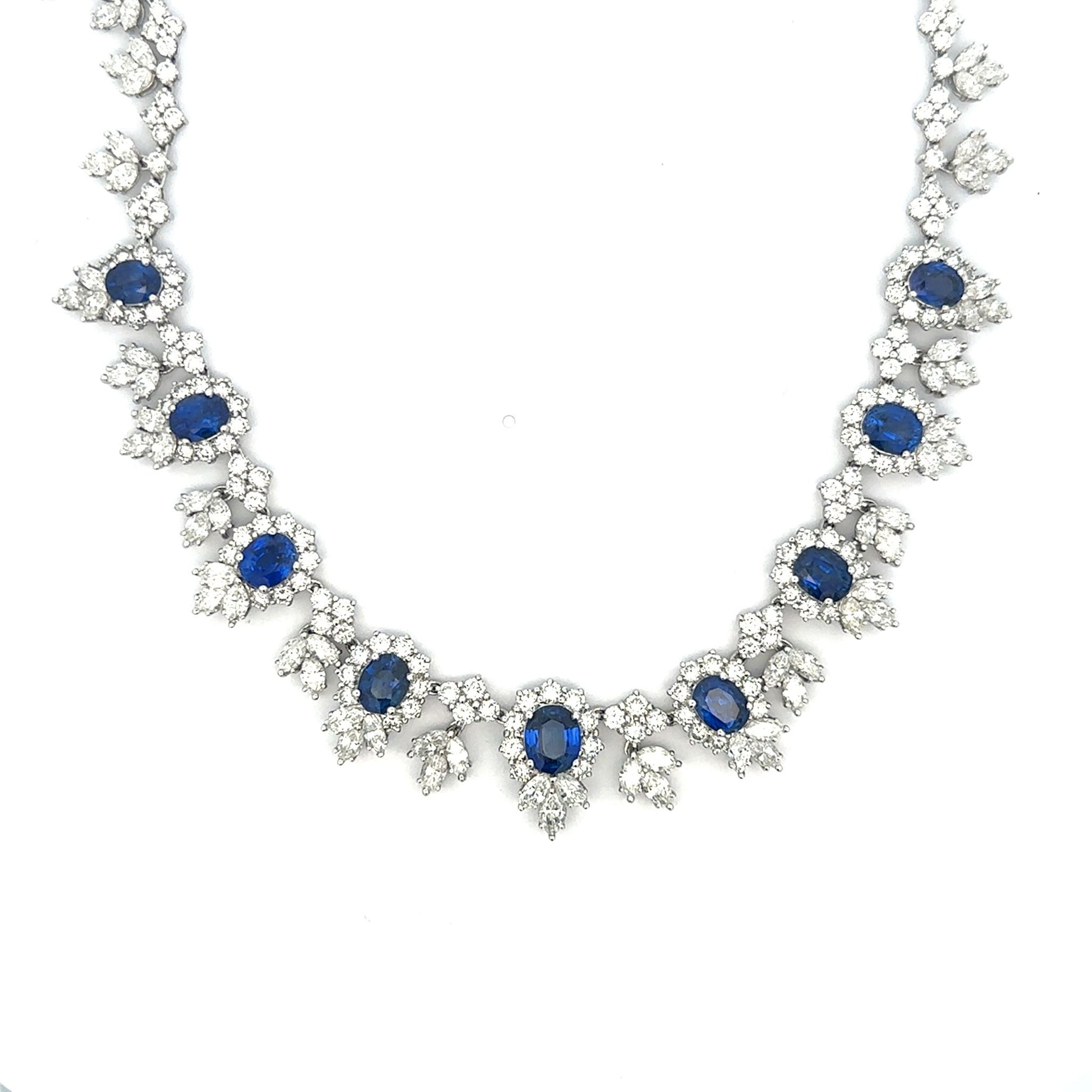 18K White Gold Oval Blue Sapphires with Marquise & Round Cut Diamond Necklace Oval Blue Sapphires 10pcs, 13.98ct