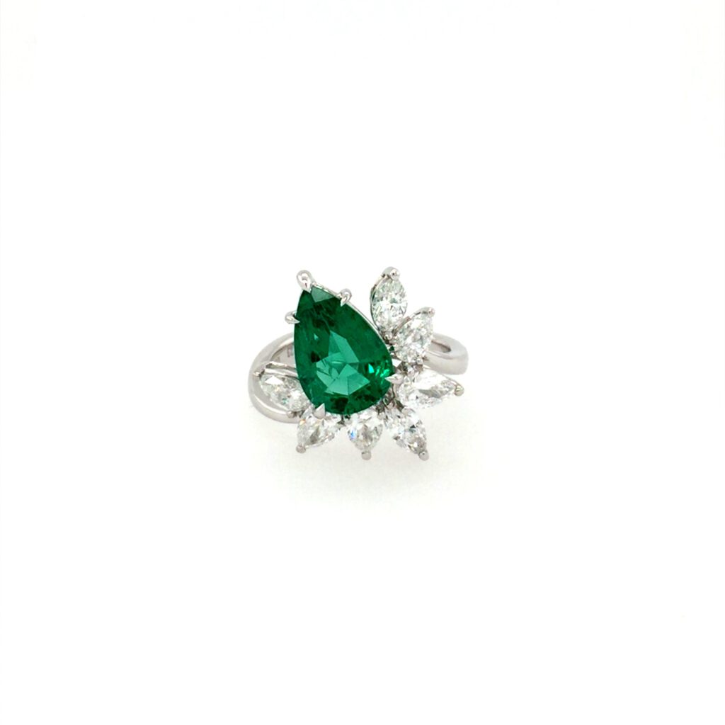 18K White Gold Vintage Design Ring Set With Pear Shape Green Emerald & Round Brilliant Cut Diamond