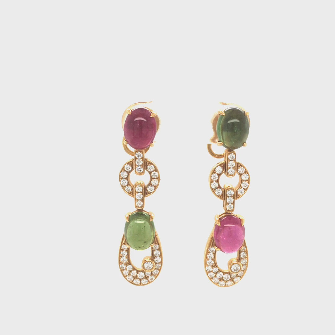 18K Yellow Gold Fancy Design Earrings Set With Cabochon Tourmaline & Diamonds